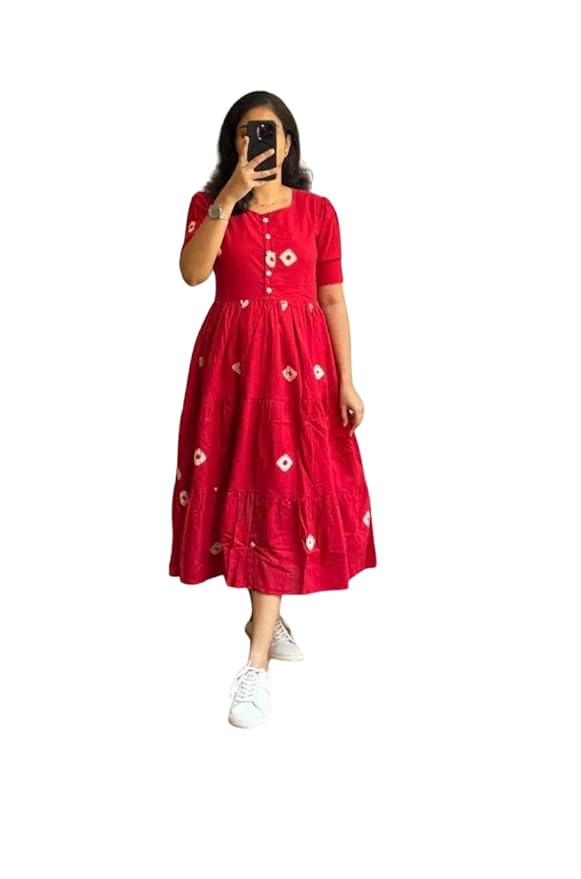 Make a stylish statement with this charming red cotton midi dress. The dress features an elegant button-front design and short sleeves for comfort. The standout element is the beautiful white diamond print pattern scattered across the fabric, creating a delightful visual appeal. The tiered flare design adds movement and grace to the silhouette, while the midi length makes it versatile for various occasions. The gathered waist creates a flattering fit, and the cotton fabric ensures breathability and comfort throughout the day. Perfect for casual outings or semi-formal events, this dress can be styled with white trainers for a contemporary look or dressed up with heels for more formal occasions. The combination of classic design elements with modern styling makes this dress a must-have addition to your wardrobe. The practical button closure adds both functionality and style to this beautifully crafted garment.